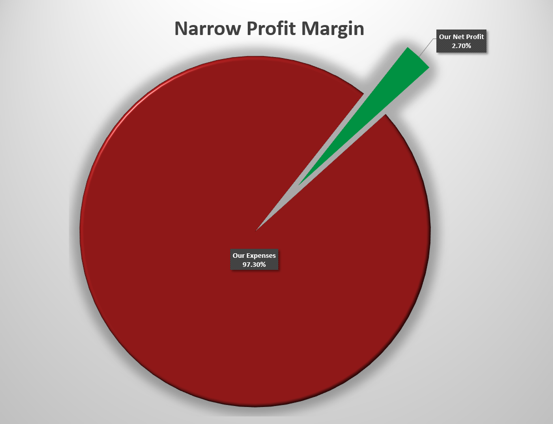 We located in a low-cost area to reduce overhead. We stress test our operations by cutting costs everywhere we can. When we find savings we split them between increased payments to vendors and price cuts to customers.